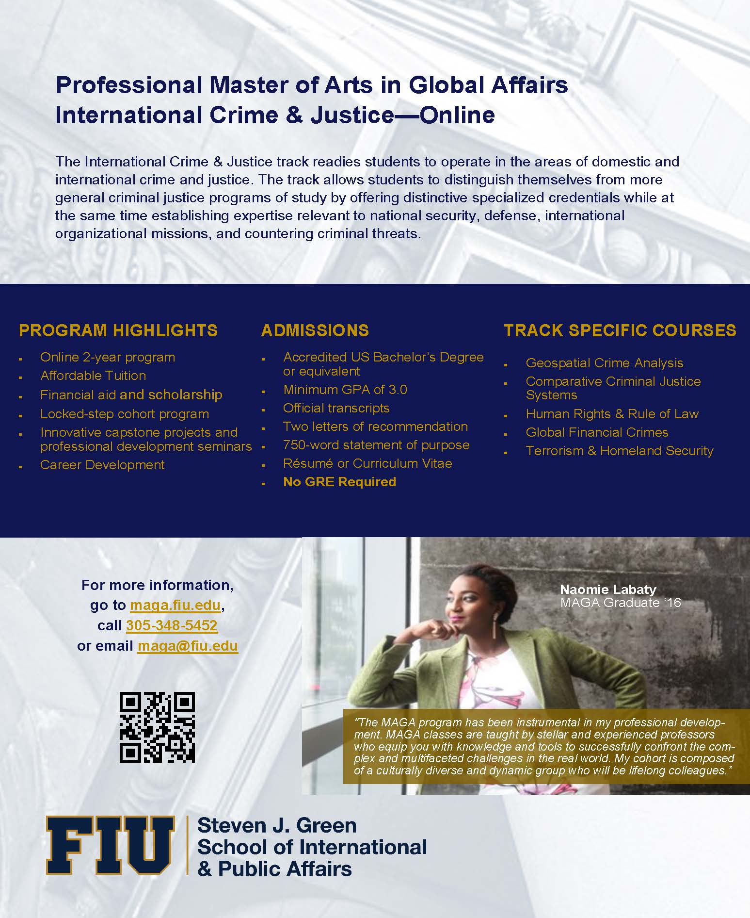 The Master of Arts in Global Affairs is accepting applications for our new online track in International Crime and Justice.